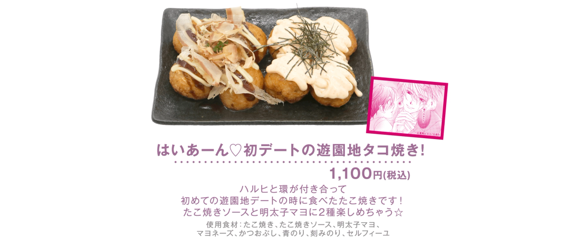 This is the takoyaki that Haruhi and Tamaki ate on their very first amusement park date after getting together! You can enjoy two flavors — takoyaki sauce and mentaiko mayo☆