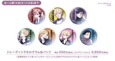 The key visuals from the Ouran High School Host Club café have been turned into dazzling hologram can badges! Size: approx. φ57mm, 7 varieties total