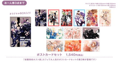 The 3rd installment of the hugely popular postcard set from the 'Ouran High School Host Club' cafe is here♪ Size: BOX / W approx. 105mm × H approx. 155mm, Postcard / approx. 100mm × approx. 148mm, 12 cards included